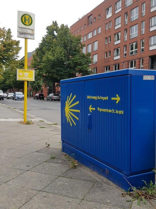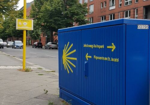 Stromkästen weisen den Weg vom und zum Pilgerzentrum St. Jacobi in Kreuzberg